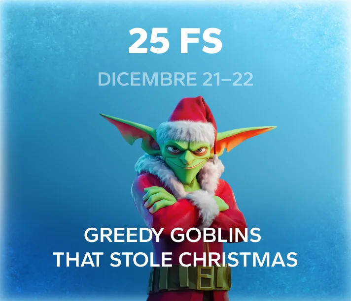 Questo bonus è disponibile dal 19.12.2025 al 20.12.2025. - Per ricevere il Bonus 25 FS, il giocatore deve puntare almeno 45 EUR / 45 USD / 450 NOK / 80 AUD / 72 CAD / 90 NZD / 765 ZAR / 36 CHF / 0.00056 BTC / 0.0164 ETH / 0.62 LTC / 0.087 BCH / 365 DOG / 45 USDT / 25 XRP / 180 TRX sulla slot Greedy Goblins That Stole Christmas.