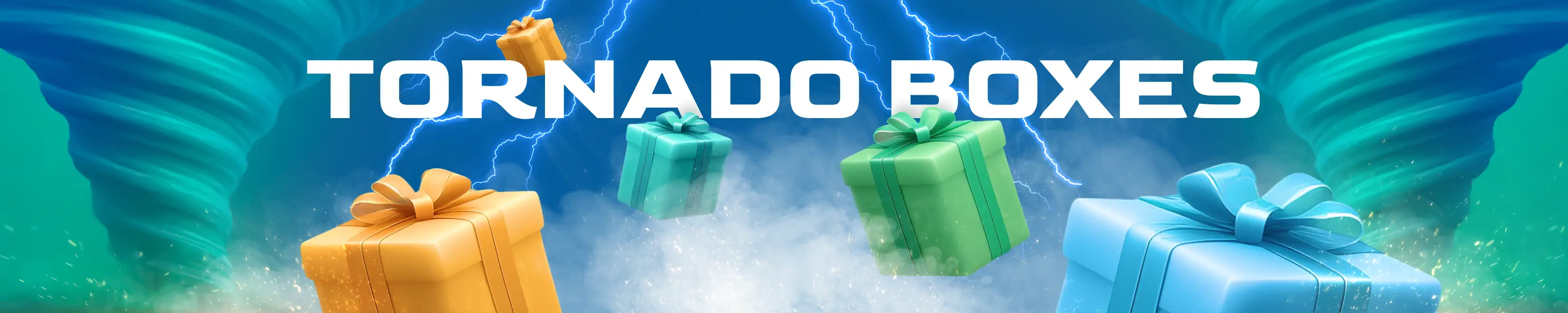 - Za pridobitev škatle Tornado MEGA morajo igralci vplačati vsaj 100 EUR / 100 USD / 1000 NOK / 100 AUD / 100 CAD / 100 NZD / 2000 ZAR / 100 CHF / 0.00105 BTC / 0.027 ETH / 0.88 LTC / 0.2 BCH / 250 DOG / 100 USDT / 50 XRP / 350 TRX z bonus kodo MEGA do trikrat na dan UTC. Po odprtju virtualne škatle na promocijski strani lahko igralci prejmejo enega od naslednjih 10 naključnih bonusov: